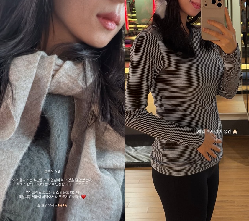 그는 "본식 드레스 고르는 릴스 만들고 있는데 웨딩 촬영 때랑 체급이 바뀌어서 너무 웃겨요"라고 덧붙이며 임신 후 변화에 대해 솔직히 이야기했다.