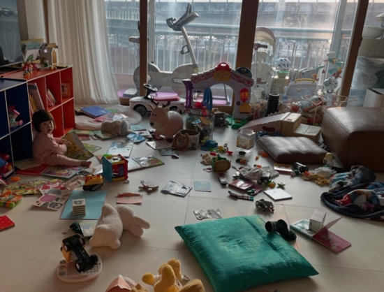공개된 사진 속에는 집 안이 어질러져 있는 모습이 담겨 있어 눈길을 끌었다. 장난감과 생활 용품이 여기저기 흩어져 있어 난장판이 된 공간의 현실감을 보여줬다.