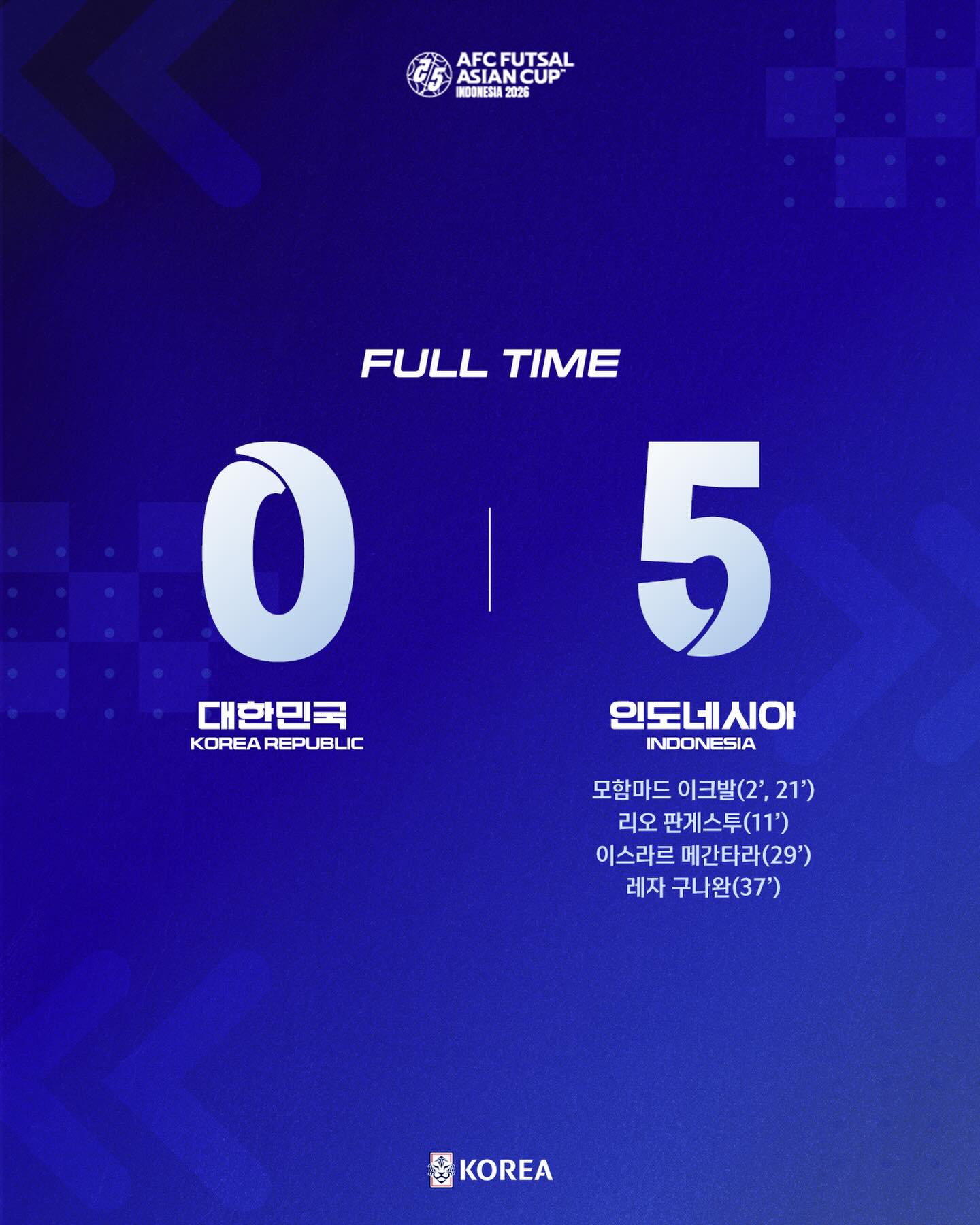 (엑스포츠뉴스 나승우 기자) 한국 풋살 대표팀이 2026 아시아축구연맹(AFC) 풋살 아시안컵에서 개최국 인도네시아에 참패했다.