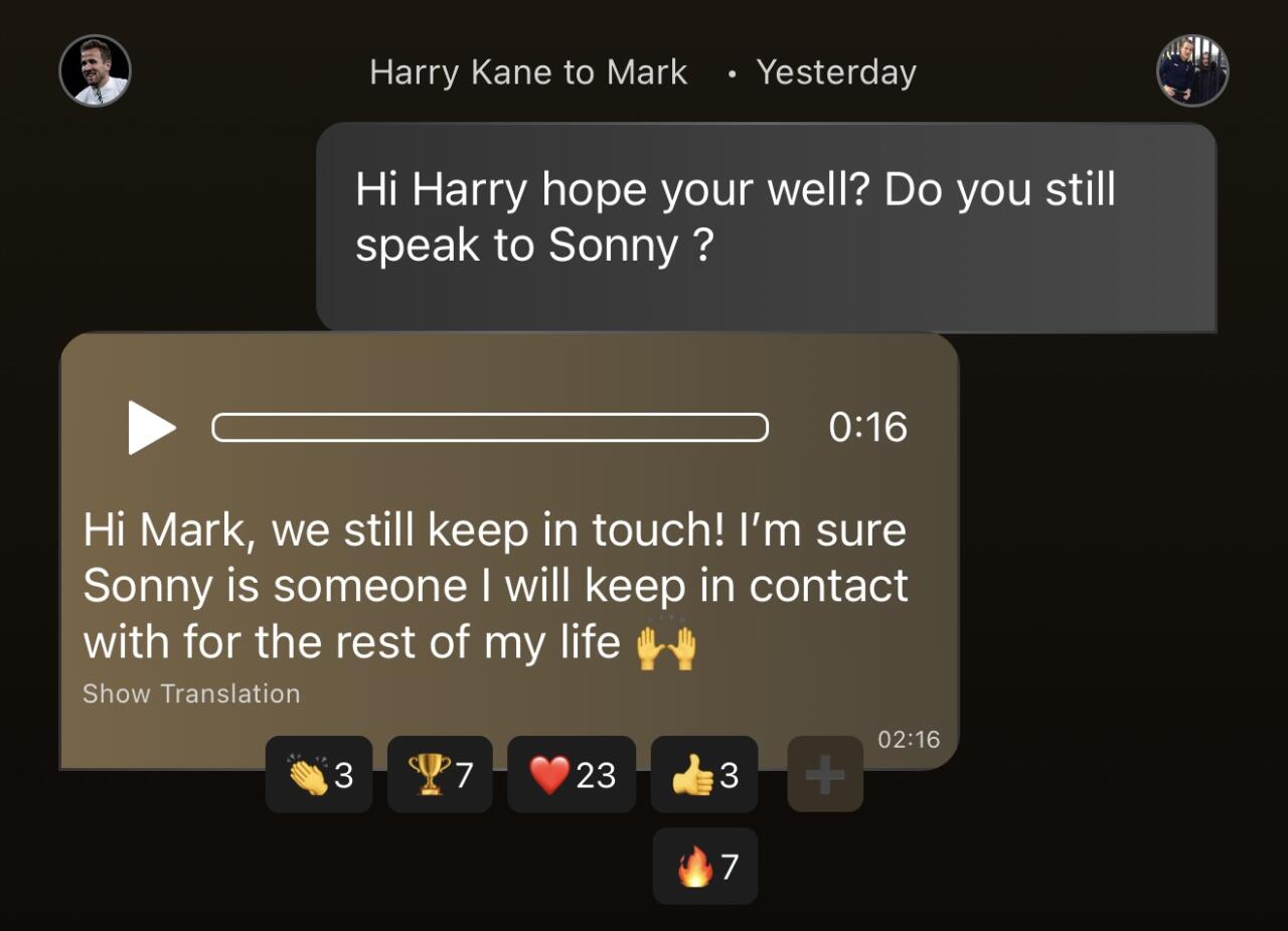 해당 팬은 소통 어플리케이션을 통해 "해리 잘 지내지? 여전히 쏘니(손흥민)와 연락하고 있어?"라고 질문했고, 케인은 팬의 질문에 "우리는 여전히 연락을 주고 받고 있어! 나는 소니가 내 남은 인생 내내 연락을 유지할 사람이라고 확신해"라고 답했다.