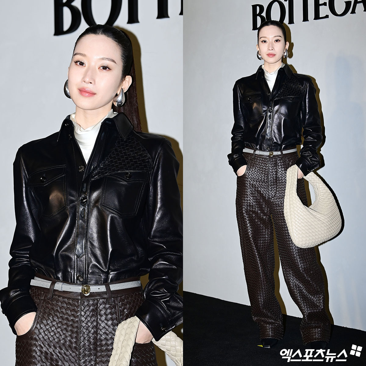 이날 행사에 참석한 문가영은 은은한 광택이 감도는 블랙 컬러의 나파 가죽 오버 셔츠를 착용해 중성적이면서 세련된 무드를 연출했다. 하의로는 정교하게 엮인 가죽 질감이 돋보이는 다크 브라운 팬츠를 매치해 룩의 깊이감을 더했다.
