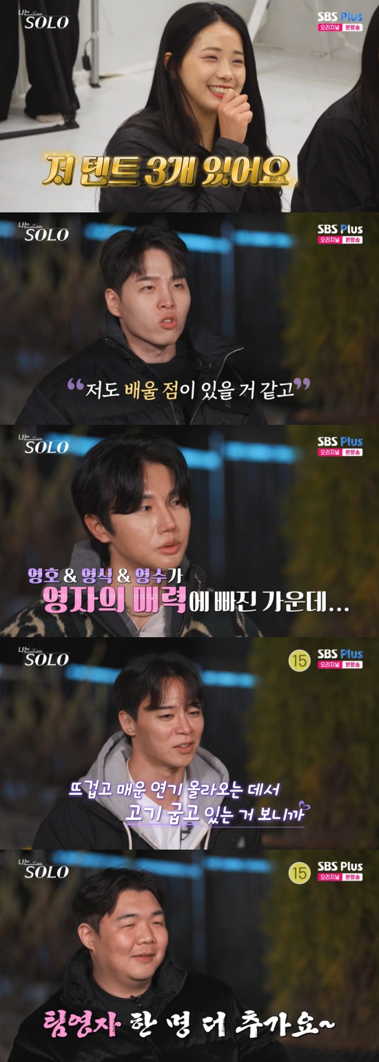 30기 출연자들은 첫날 저녁 먹기 전, 서로 취미에 대해 이야기를 나눴다. 여기서도 영자는 "캠핑이 취미다. 혼자 잘 다닌다. 텐트 잘 친다. 세 개 갖고 있다"며 남다른 활동성과 생활력을 어필했다. 특히 이어진 바베큐 식사에서는 영자가 주도적으로 나서 불을 피우고 고기를 굽는 모습이 펼쳐졌다.