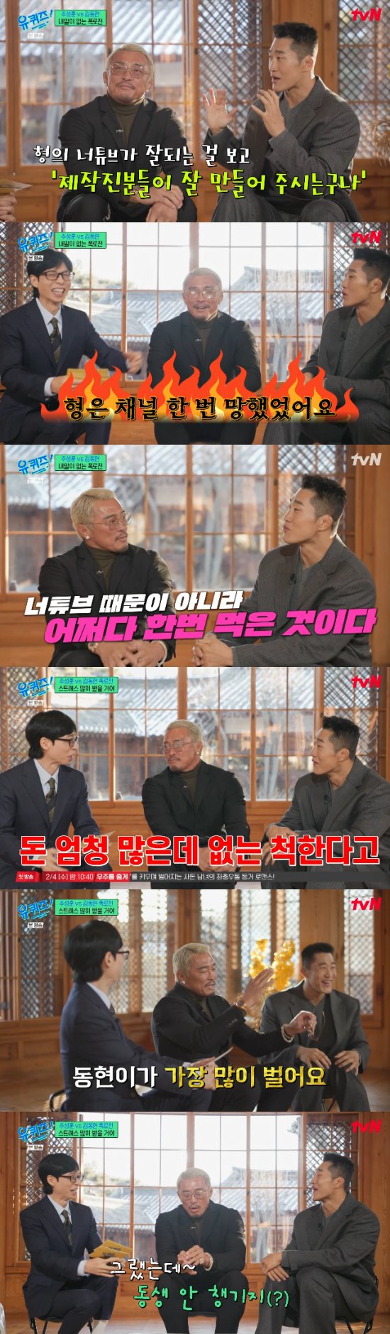 김동현은 유튜브를 시작한지 1년만에 구독자수 200만 명을 돌파한 추성훈에게 질투(?)를 하면서 "사실 형이 한 번 망했었다. '추추TV'라고 있었는데, 이제는 검색도 안된다. 지금 유튜브 제작진이 형의 매력을 잘 발견해서 만들어주시는거다. 감사하게 생각해야한다"고 돌직구를 던졌다.