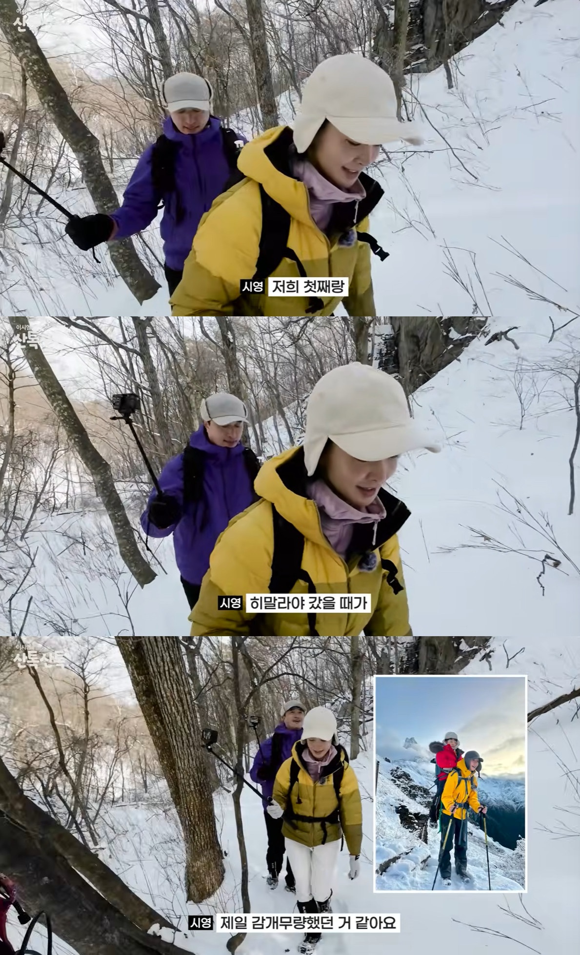 설산을 오르던 이시영은 '등산하면서 언제가 제일 행복했나'라는 질문에 "아무래도 저희 첫째랑 히말라야 갔을 때가 제일 감개무량했다"고 이야기했다.