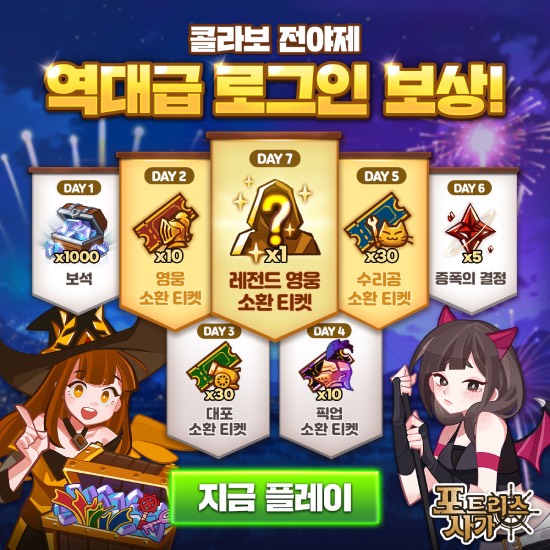 출석 보상은 1일 차 보석 1,000개를 시작으로 영웅·대포·픽업·수리공 소환 티켓, 증폭의 결정 등이 단계적으로 지급된다. 7일 출석을 달성하면 레전드 영웅 소환 티켓 1장을 추가로 받을 수 있다.