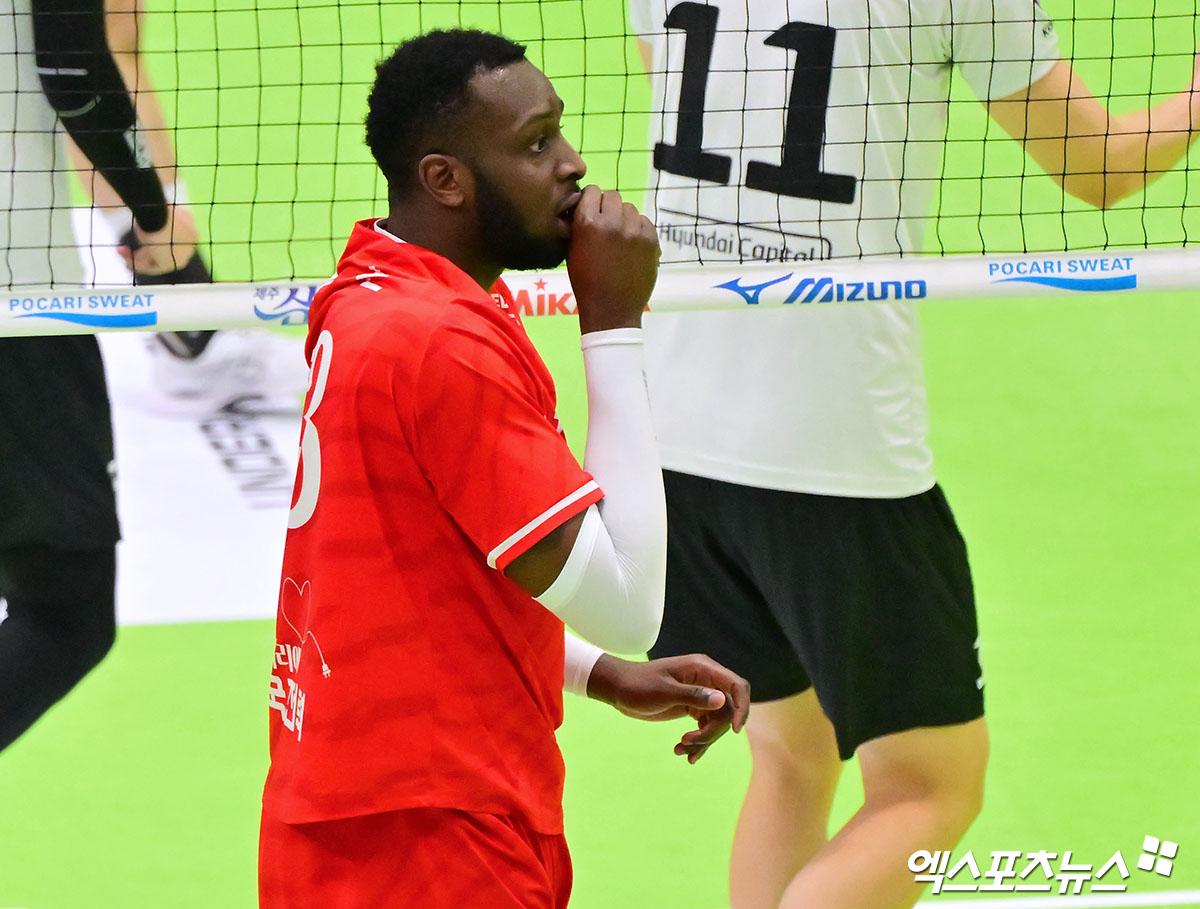 (엑스포츠뉴스 수원, 김한준 기자) 29일 오후 경기도 수원실내체육관에서 열린 '진에어 2025-2026 V-리그' 한국전력과 현대캐피탈의 경기, 한국전력 베논이 공격 실패 후 아쉬워하고 있다.