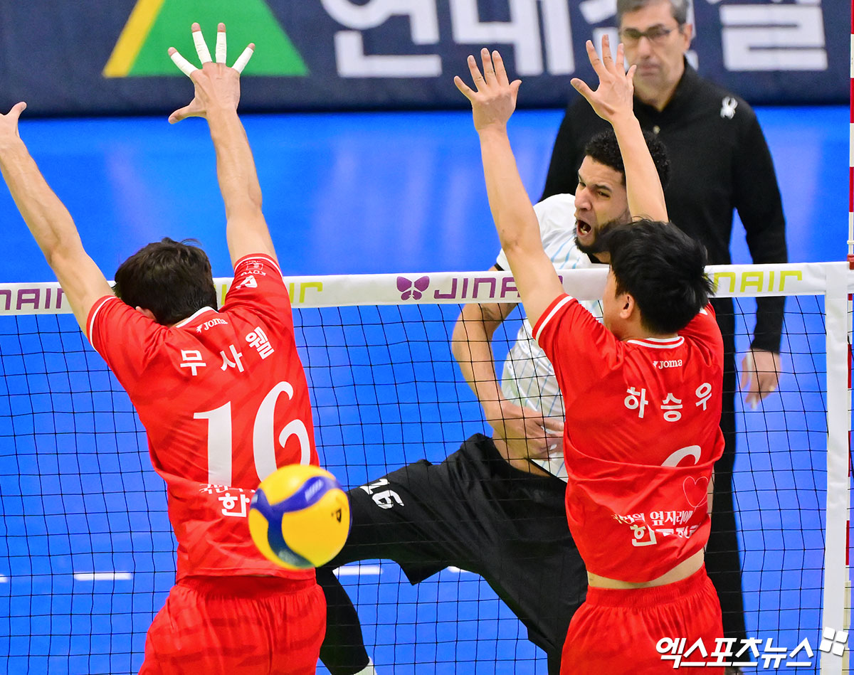 (엑스포츠뉴스 수원, 김한준 기자) 29일 오후 경기도 수원실내체육관에서 열린 '진에어 2025-2026 V-리그' 한국전력과 현대캐피탈의 경기, 현대캐피탈 레오가 공격을 시도하고 있다.