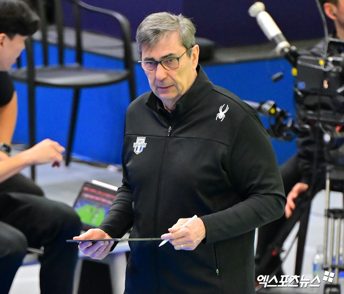(엑스포츠뉴스 수원, 김한준 기자) 29일 오후 경기도 수원실내체육관에서 열린 '진에어 2025-2026 V-리그' 한국전력과 현대캐피탈의 경기, 현대캐피탈 필립 블랑 감독이 경기를 지켜보고 있다.