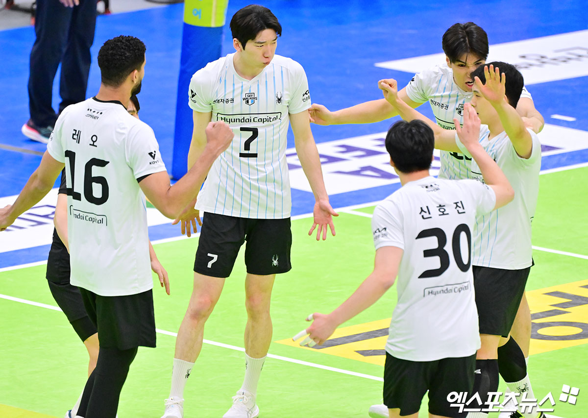(엑스포츠뉴스 수원, 김한준 기자) 29일 오후 경기도 수원실내체육관에서 열린 '진에어 2025-2026 V-리그' 한국전력과 현대캐피탈의 경기, 현대캐피탈 선수들이 득점 후 기뻐하고 있다.