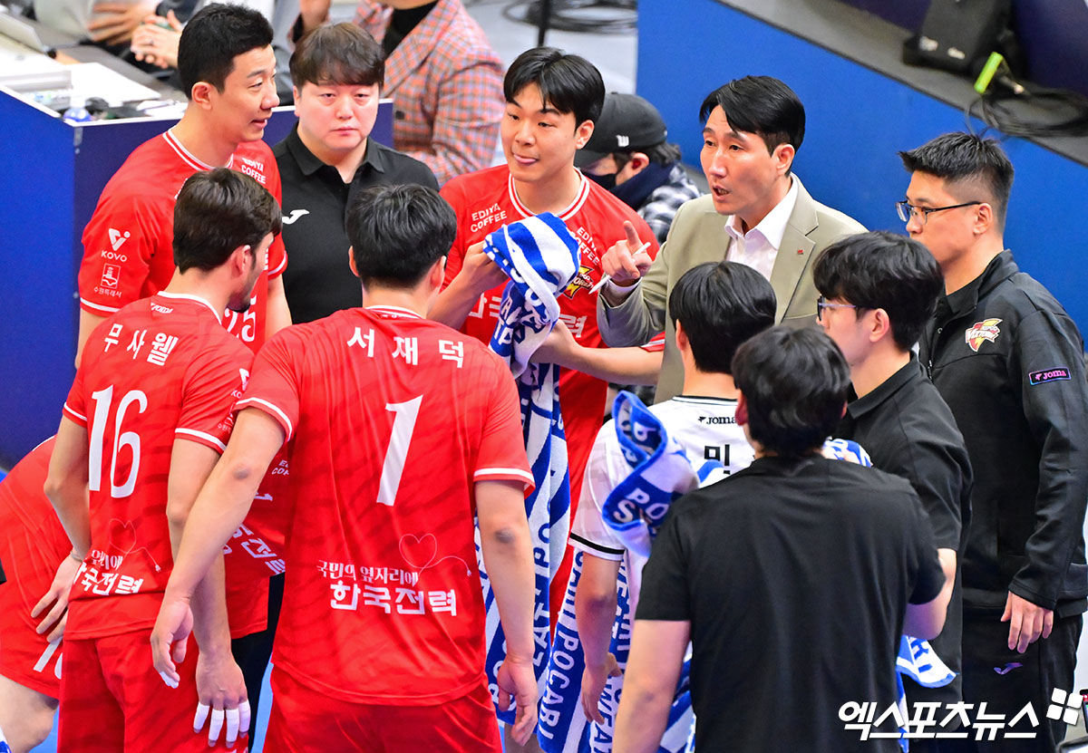 (엑스포츠뉴스 수원, 김한준 기자) 29일 오후 경기도 수원실내체육관에서 열린 '진에어 2025-2026 V-리그' 한국전력과 현대캐피탈의 경기, 한국전력 권영민 감독이 작전타임을 갖고 있다.