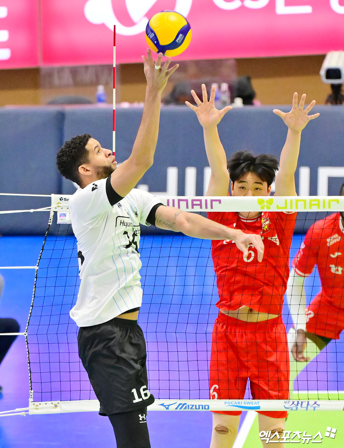 (엑스포츠뉴스 수원, 김한준 기자) 29일 오후 경기도 수원실내체육관에서 열린 '진에어 2025-2026 V-리그' 한국전력과 현대캐피탈의 경기, 현대캐피탈 레오가 공격을 시도하고 있다.