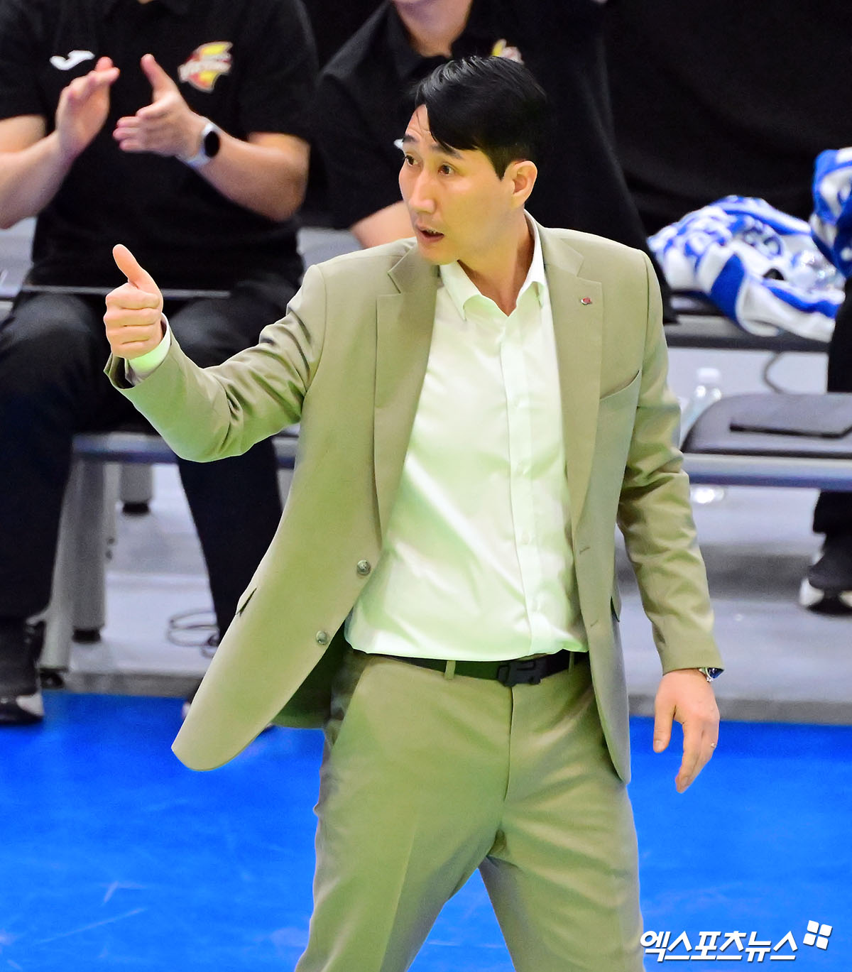 (엑스포츠뉴스 수원, 김한준 기자) 29일 오후 경기도 수원실내체육관에서 열린 '진에어 2025-2026 V-리그' 한국전력과 현대캐피탈의 경기, 한국전력 권영민 감독이 기뻐하고 있다.