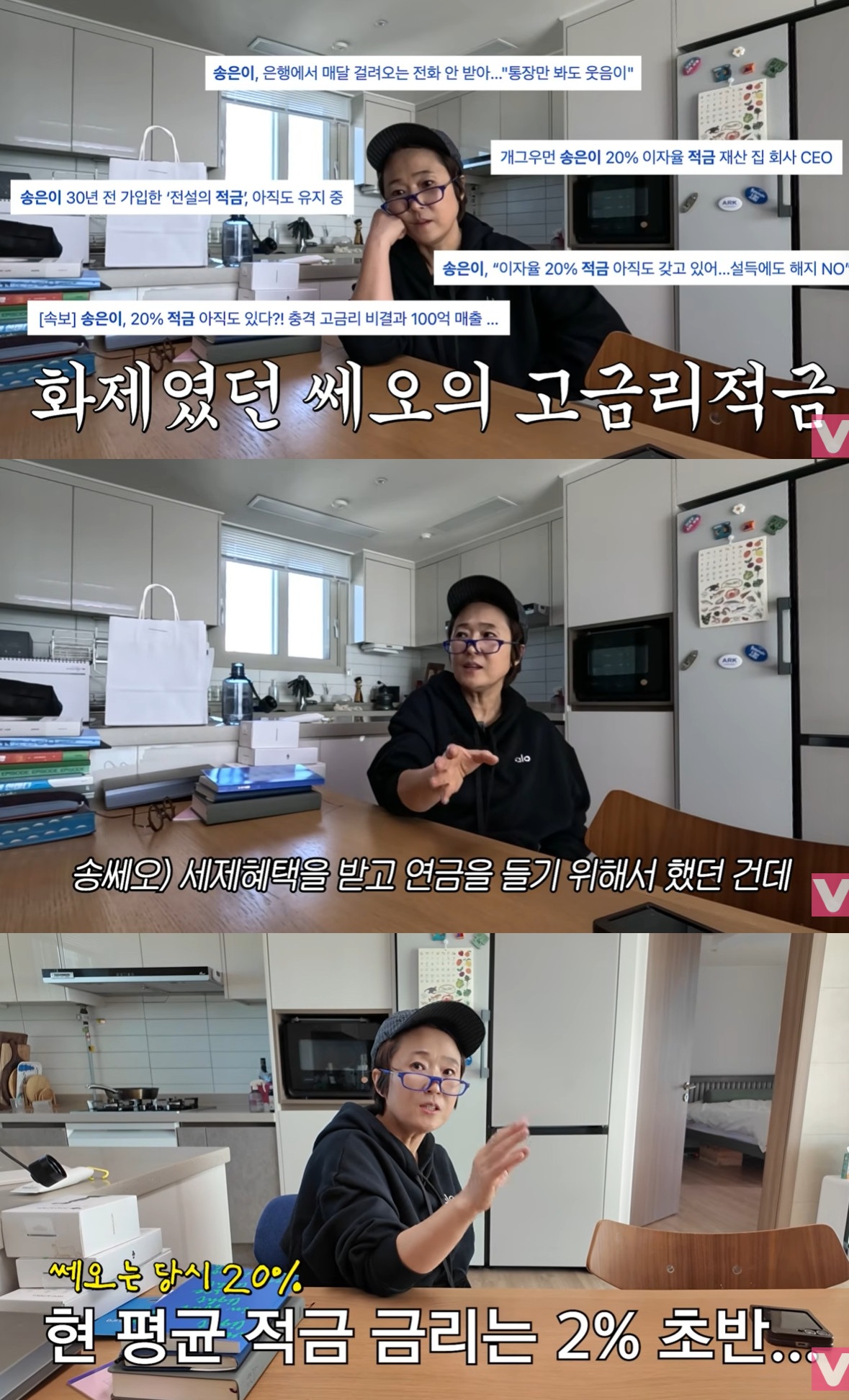 앞서 송은이는 1993년에 은행 연금 저축에 가입해 이자율이 20%였다고 고백한 바 있다. 현재까지도 해당 상품을 해지하지 않았다는 그는 "해지 안 할 거다. 금리만 보고 있으면 얼마나 행복한지 모른다. 유일한 자랑거리다"라고 밝힌 바 있다.