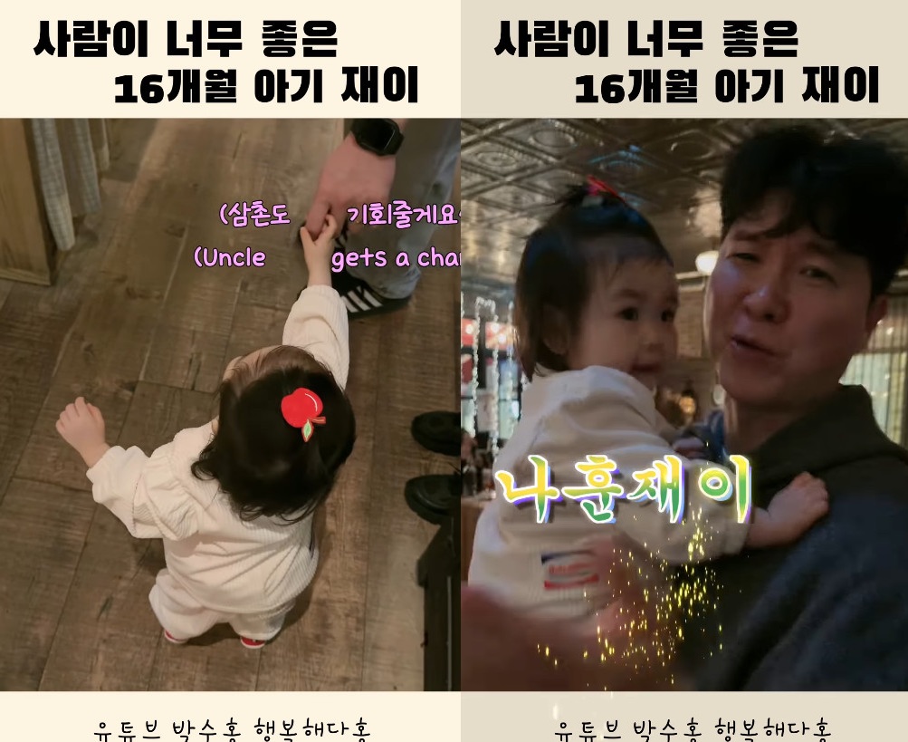 29일 박수홍과 김다예는 개인 채널에 '사람이 너무 좋은 16개월 아기 재이'라는 제목의 짧은 영상을 게재했다.