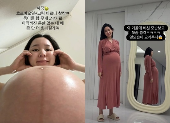 사진에는 초아가 로우앵글로 셀카를 촬영한 모습이 담겼다. 만삭의 배가 화면 대부분을 채운 가운데, 초아는 여성은 두 손으로 볼을 받친 포즈를 취했다. 여기에 그는 "까꿍. 오일, 크림 바르다 찰칵. 둥이들 합 무게 3.4키로 아직까진 튼살 없는 내 배 좀 만 더 힘내실게요"라고 적으며 출산을 앞둔 일상을 전했다.