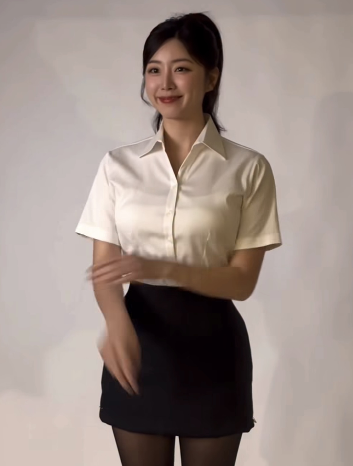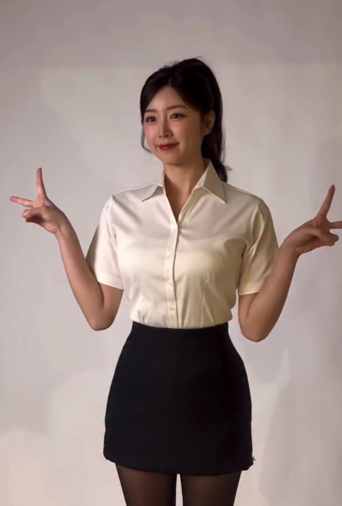 영상 속 안지현은 흰 반소매 셔츠와 짧은 검정 치마, 검은색 스타킹을 신고 정석적인 오피스룩으로 미모를 뽐냈다.