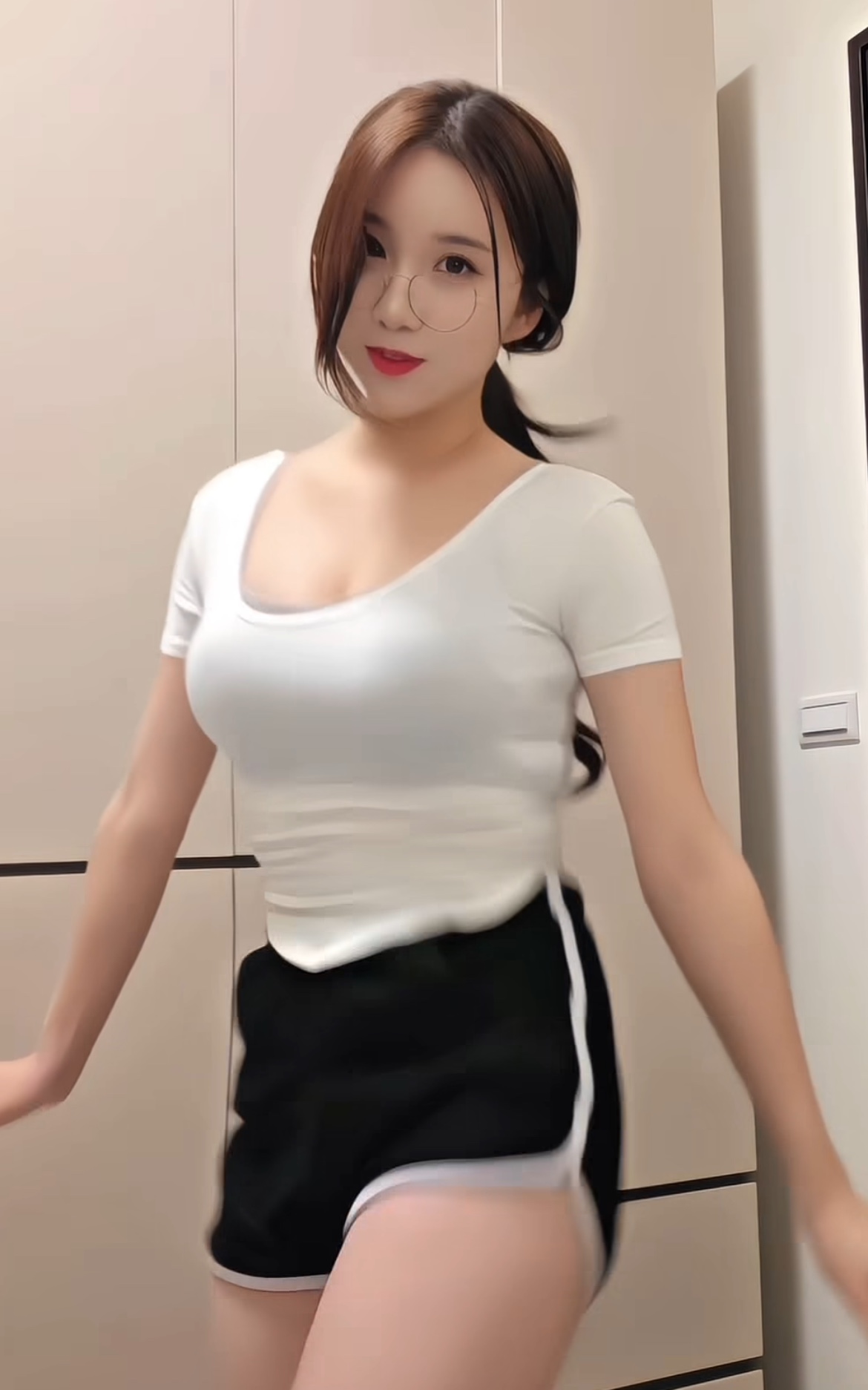 영상 속 김현영은 딱 붙는 흰색 티셔츠와 짧은 돌핀팬츠를 입고 춤을 추며 완벽한 볼륨감을 자랑했다.