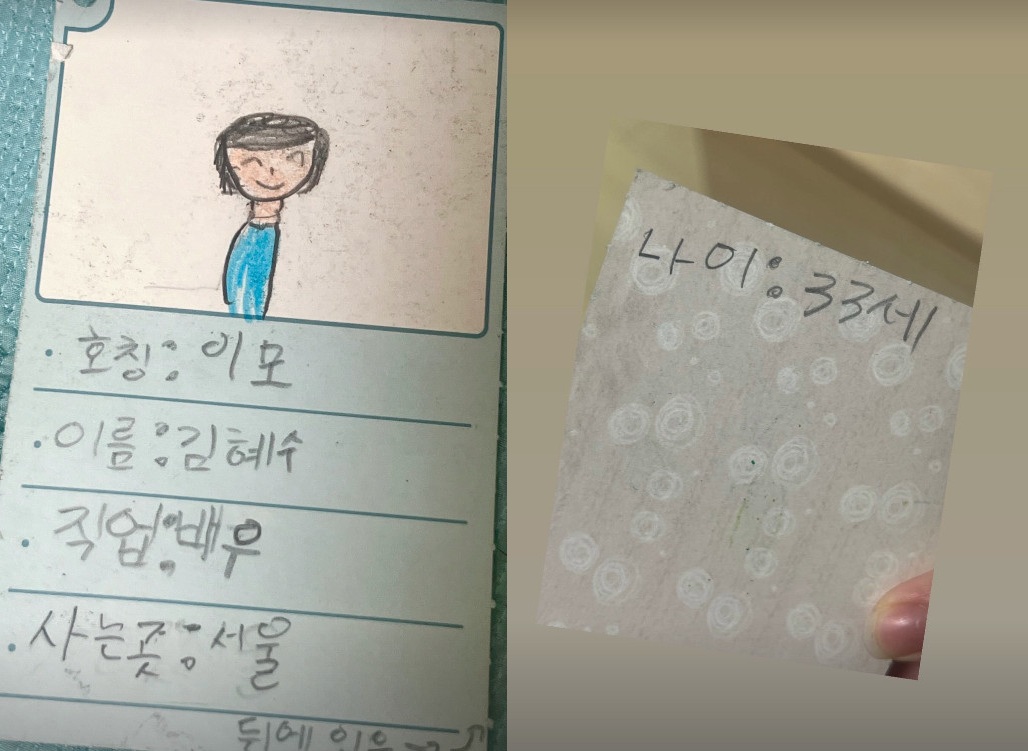 김혜수 호칭을 '이모'라고 적은 조카는 그의 직업과 사는 곳을 적어 눈길을 끈다. 이어 카드 뒷면에는 '나이: 33세'로 적혀있어 웃음을 자아낸다.
