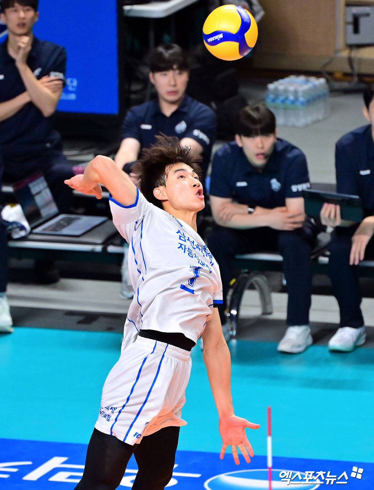 (엑스포츠뉴스 장충, 김한준 기자) 30일 오후 서울 장충체육관에서 열린 '진에어 2025-2026 V-리그' 우리카드와 삼성화재의 경기, 삼성화재 김우진이 공격을 시도하고 있다.