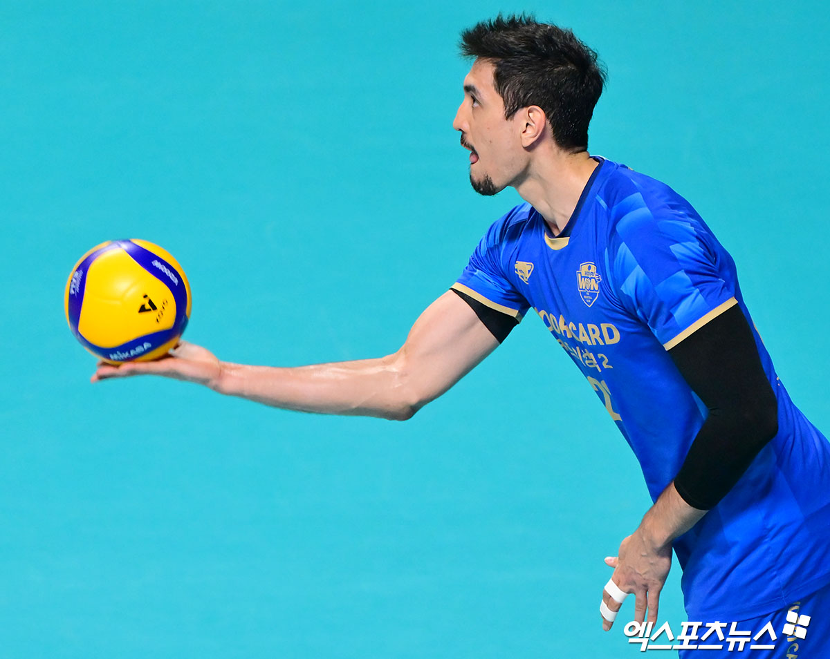 (엑스포츠뉴스 장충, 김한준 기자) 30일 오후 서울 장충체육관에서 열린 '진에어 2025-2026 V-리그' 우리카드와 삼성화재의 경기, 우리카드 아라우조가 서브를 시도하고 있다.