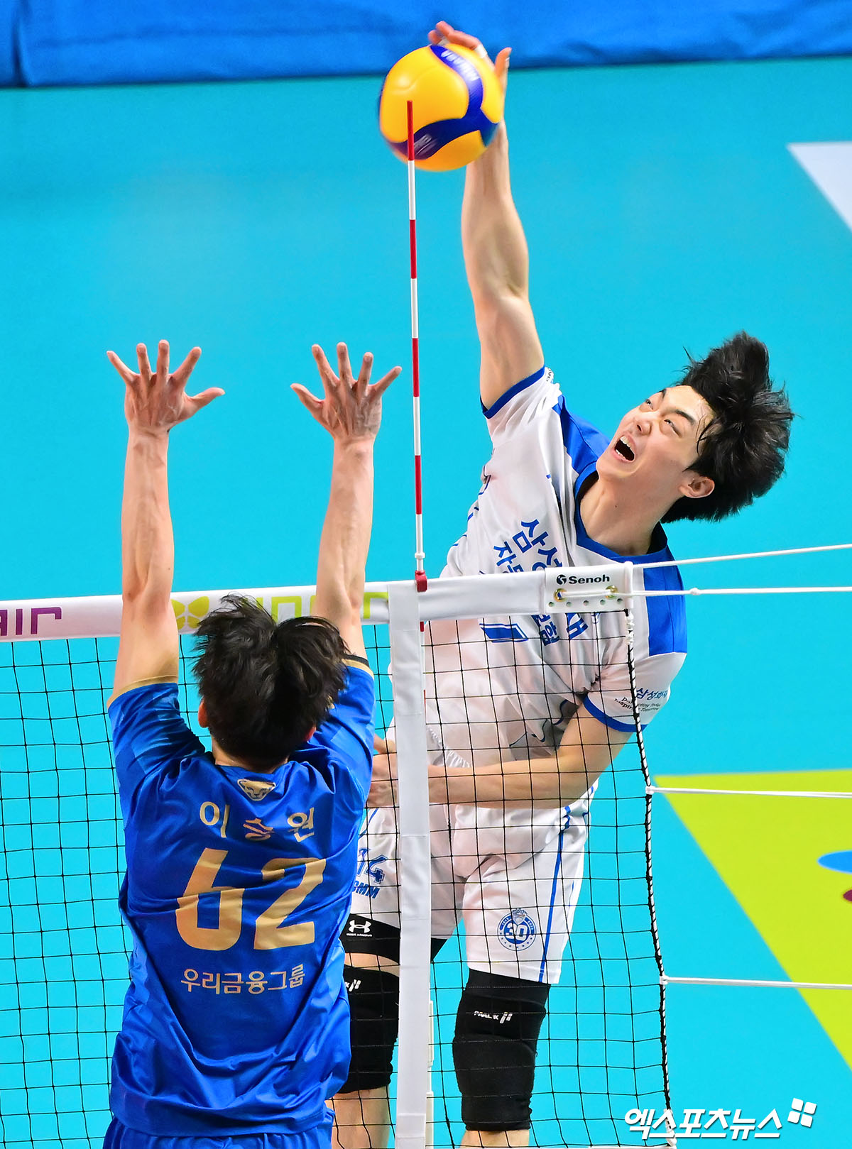 (엑스포츠뉴스 장충, 김한준 기자) 30일 오후 서울 장충체육관에서 열린 '진에어 2025-2026 V-리그' 우리카드와 삼성화재의 경기, 삼성화재 이우진이 공격을 시도하고 있다.