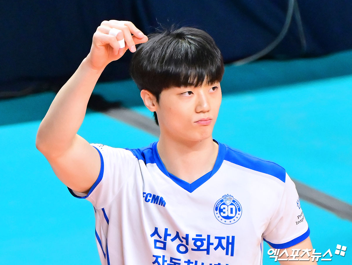 (엑스포츠뉴스 장충, 김한준 기자) 30일 오후 서울 장충체육관에서 열린 '진에어 2025-2026 V-리그' 우리카드와 삼성화재의 경기, 삼성화재 이우진이 터치아웃을 주장하고 있다.