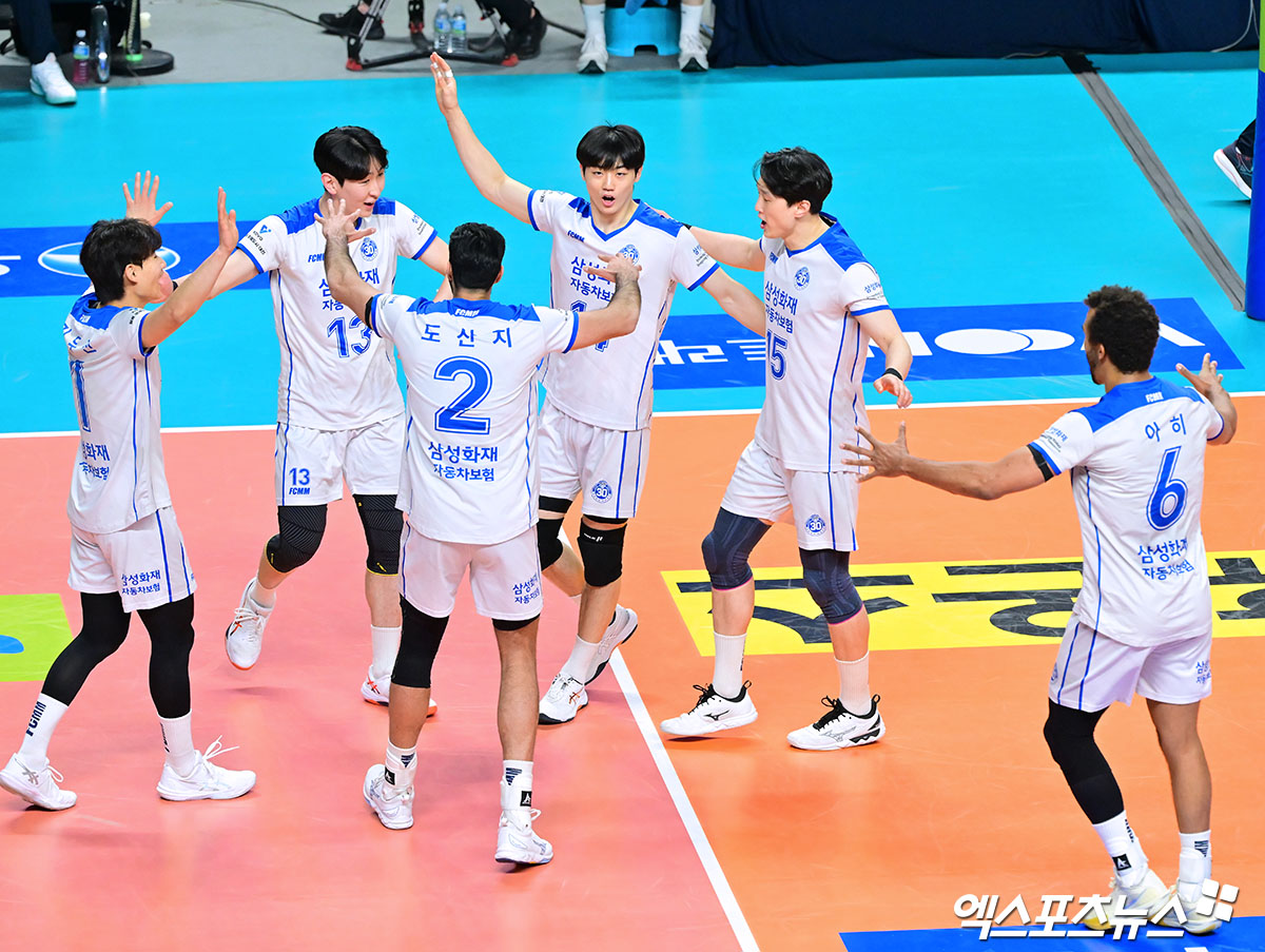 (엑스포츠뉴스 장충, 김한준 기자) 30일 오후 서울 장충체육관에서 열린 '진에어 2025-2026 V-리그' 우리카드와 삼성화재의 경기, 삼성화재 선수들이 득점 후 기뻐하고 있다.