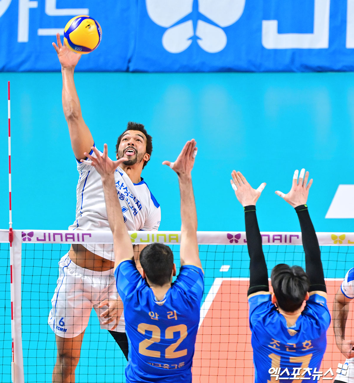 (엑스포츠뉴스 장충, 김한준 기자) 30일 오후 서울 장충체육관에서 열린 '진에어 2025-2026 V-리그' 우리카드와 삼성화재의 경기, 삼성화재 아히가 공격을 시도하고 있다.