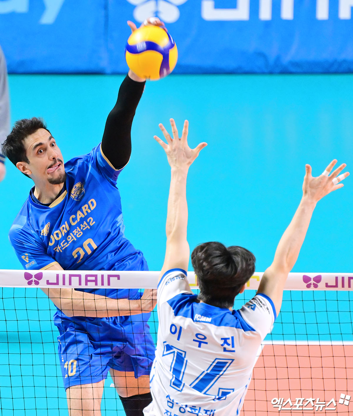 (엑스포츠뉴스 장충, 김한준 기자) 30일 오후 서울 장충체육관에서 열린 '진에어 2025-2026 V-리그' 우리카드와 삼성화재의 경기, 우리카드 아라우조가 득점 후 기뻐하고 있다.