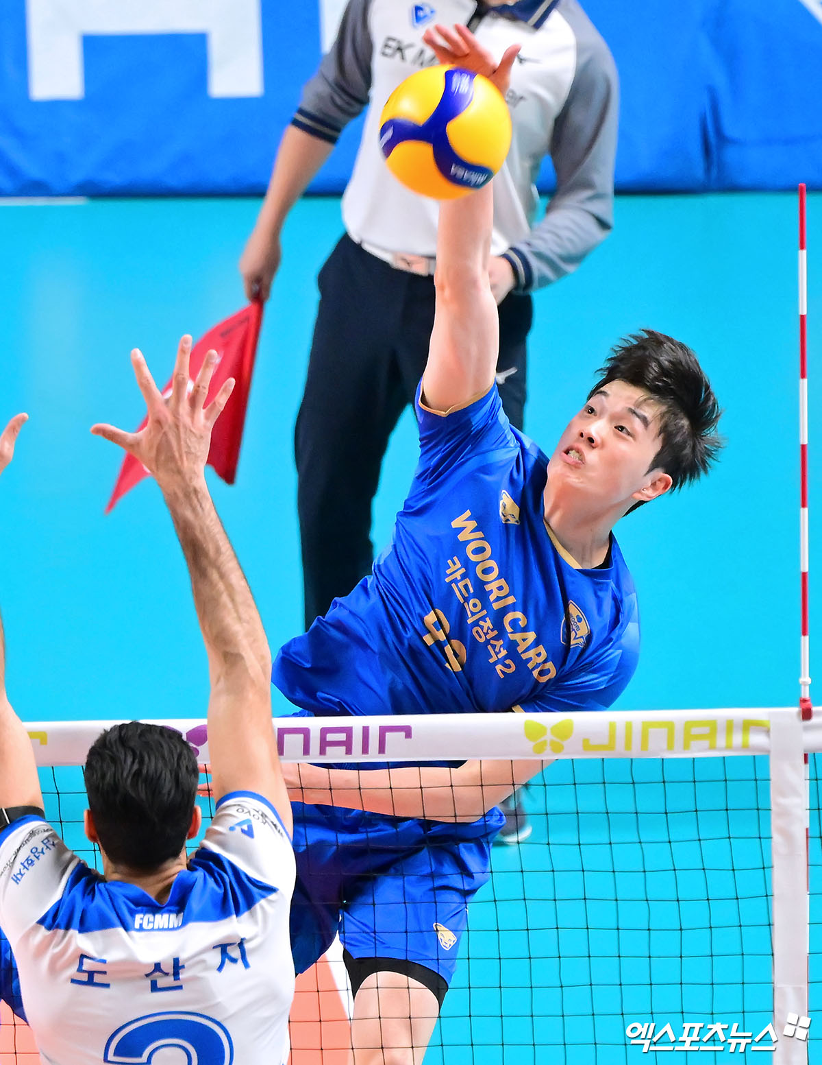 (엑스포츠뉴스 장충, 김한준 기자) 30일 오후 서울 장충체육관에서 열린 '진에어 2025-2026 V-리그' 우리카드와 삼성화재의 경기, 우리카드 김지한이 공격을 시도하고 있다.