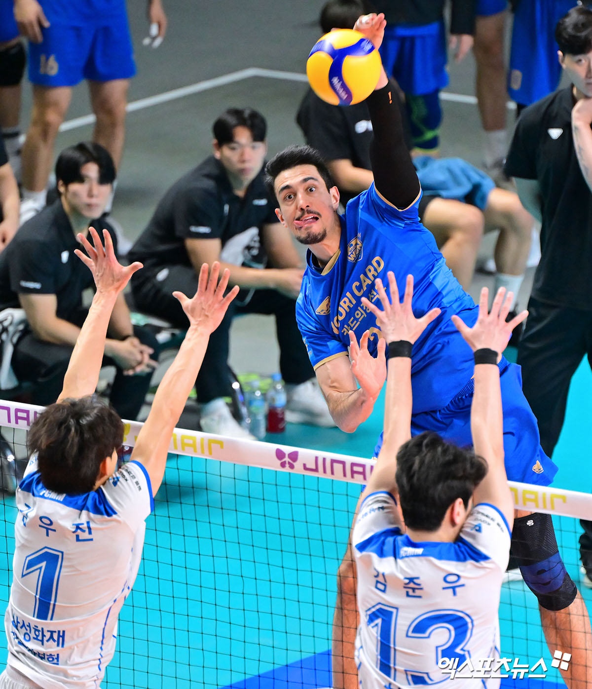 (엑스포츠뉴스 장충, 김한준 기자) 30일 오후 서울 장충체육관에서 열린 '진에어 2025-2026 V-리그' 우리카드와 삼성화재의 경기, 우리카드 아라우조가 공격을 시도하고 있다.