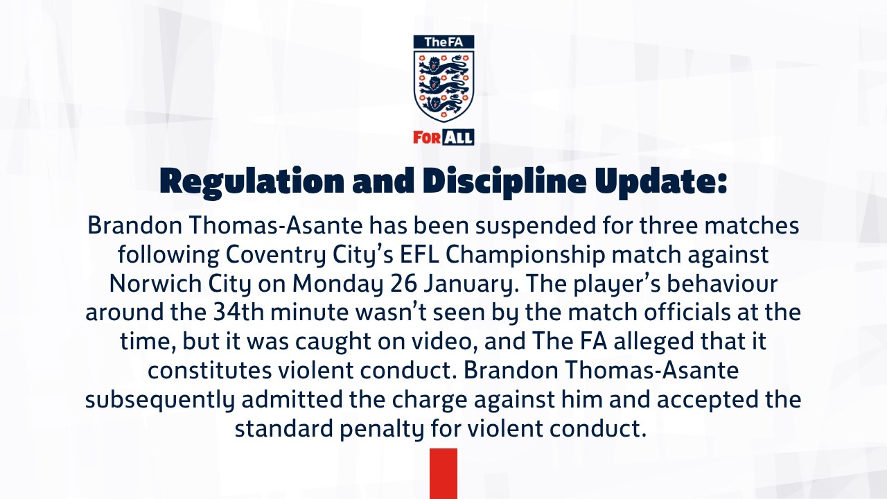코번트리 시티는 지난 30일 구단 공식 홈페이지를 통해 FA의 입장을 전하며 "브랜든 토마스-아산테가 경기 중 폭력 행위와 관련된 FA의 기소 내용을 인정했고, 이에 따라 표준 징계를 수용했다"고 밝혔다. 이어 "이번 징계로 토마스-아산테는 향후 공식전 3경기에 출전할 수 없게 됐다"고 전했다.