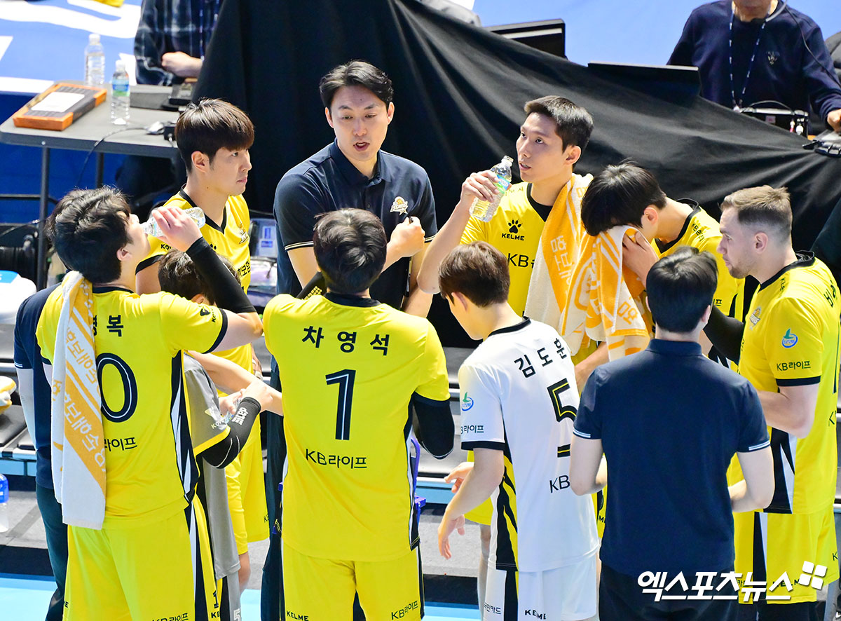 (엑스포츠뉴스 인천, 김한준 기자) 31일 오후 인천 계양체육관에서 열린 '진에어 2025-2026 V-리그' 대한항공과 KB손해보험의 경기, KB손해보험 하현용 감독대행이 작전타임을 갖고 있다.