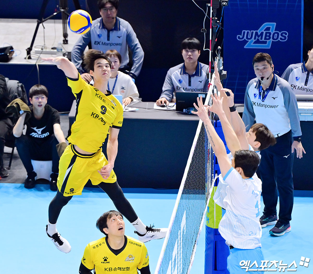 (엑스포츠뉴스 인천, 김한준 기자) 31일 오후 인천 계양체육관에서 열린 '진에어 2025-2026 V-리그' 대한항공과 KB손해보험의 경기, KB손해보험 임성진이 공격을 시도하고 있다.