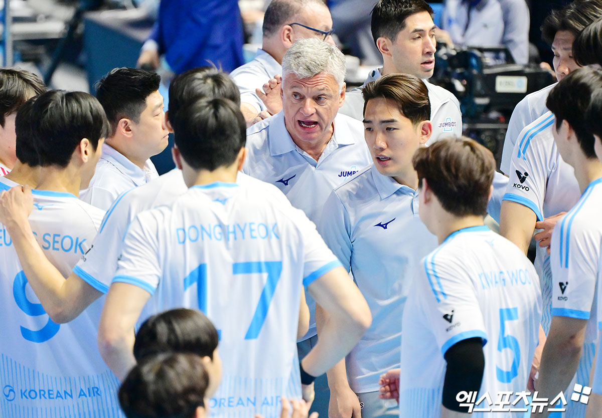 (엑스포츠뉴스 인천, 김한준 기자) 31일 오후 인천 계양체육관에서 열린 '진에어 2025-2026 V-리그' 대한항공과 KB손해보험의 경기, 대한항공 헤난 감독이 작전을 지시하고 있다.