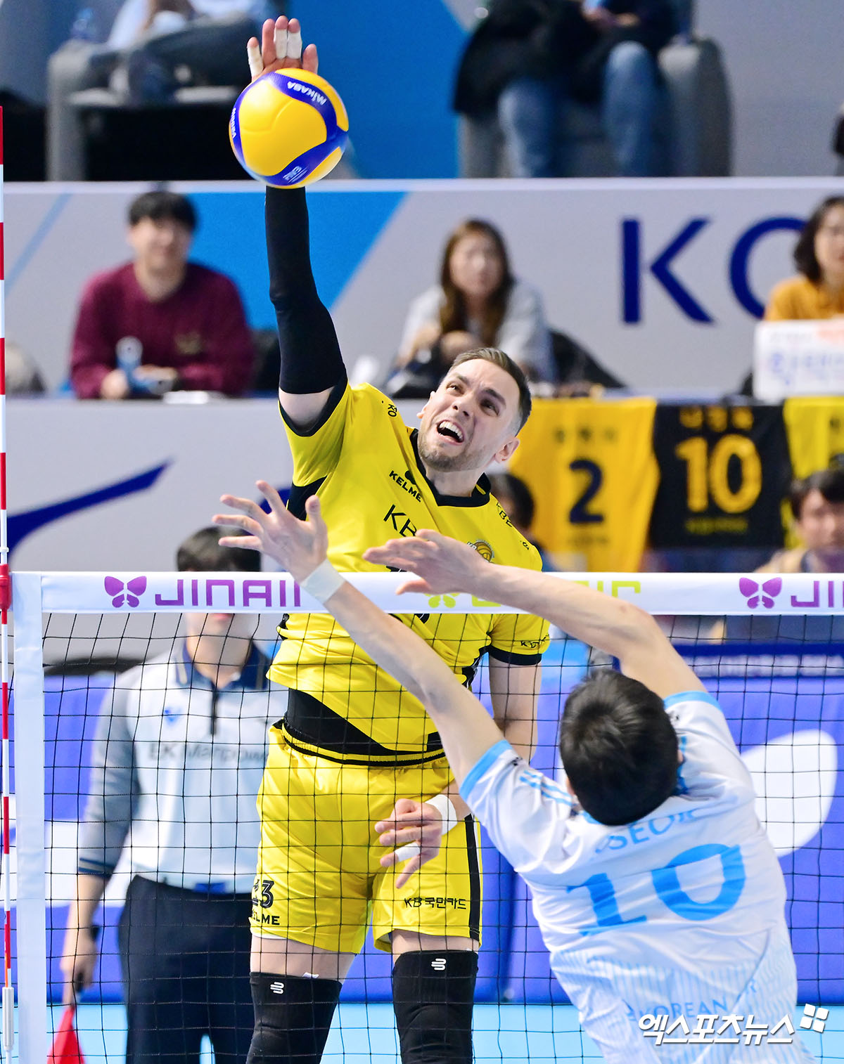 (엑스포츠뉴스 인천, 김한준 기자) 31일 오후 인천 계양체육관에서 열린 '진에어 2025-2026 V-리그' 대한항공과 KB손해보험의 경기, KB손해보험 비예나가 공격을 시도하고 있다.