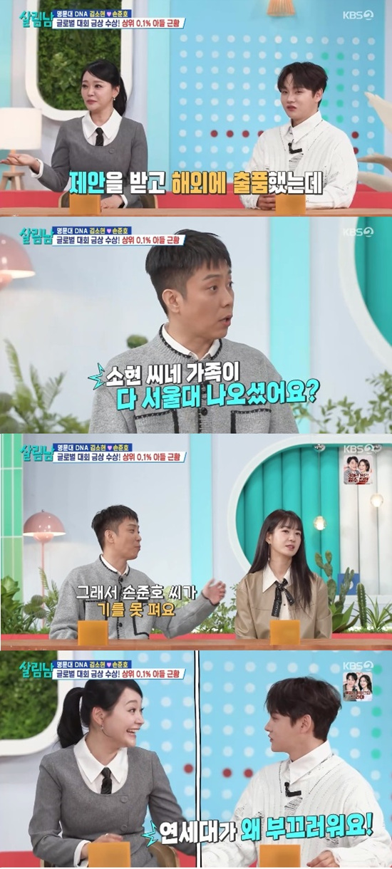 은지원은 김소현 집안이 다 서울대라는 사실을 언급하면서 연세대 출신인 손준호가 기를 못 편다고 말했다.