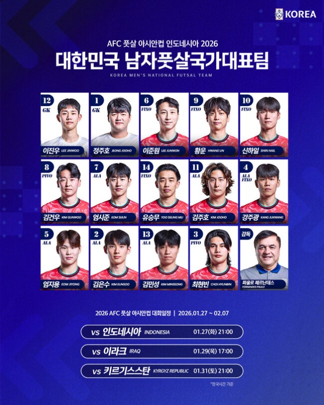 파울루 페르난데스 감독이 지휘하는 한국 풋살 국가대표팀은 지난달 31일(한국시간) 인도네시아 자카르타의 인도네시아 아레나에서 열린 2026 아시아축구연맹(AFC) 풋살 아시안컵 조별리그 A조 3차전에서 키르기스스탄에 2-3으로 패배했다.