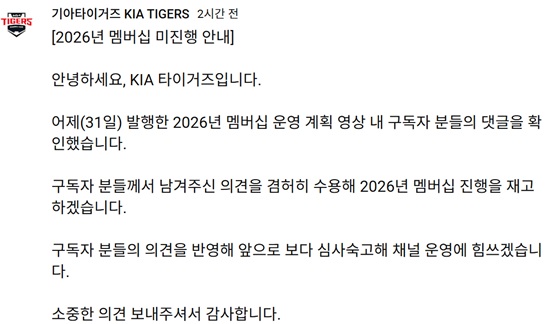 논란이 확산되자 KIA 구단은 공식 유튜브 커뮤니티를 통해 입장을 밝혔다. 구단은 유튜브 채널 공지에서 "어제(31일) 발행한 2026년 멤버십 운영 계획 영상 내 구독자 분들의 댓글을 확인했다"며 "구독자 분들께서 남겨주신 의견을 겸허히 수용해 2026년 멤버십 진행을 재고하겠다"고 밝혔다.