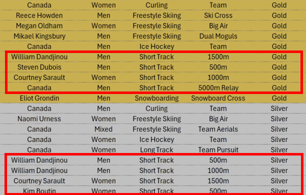 남자 500m(단지누), 남자 1000m(단지누), 여자 500m(킴 부탱), 여자 1500m(사로)에서 은메달 4개를 추가하며, 여자 3000m 계주에선 동메달을 딸 것이라고도 했다.
