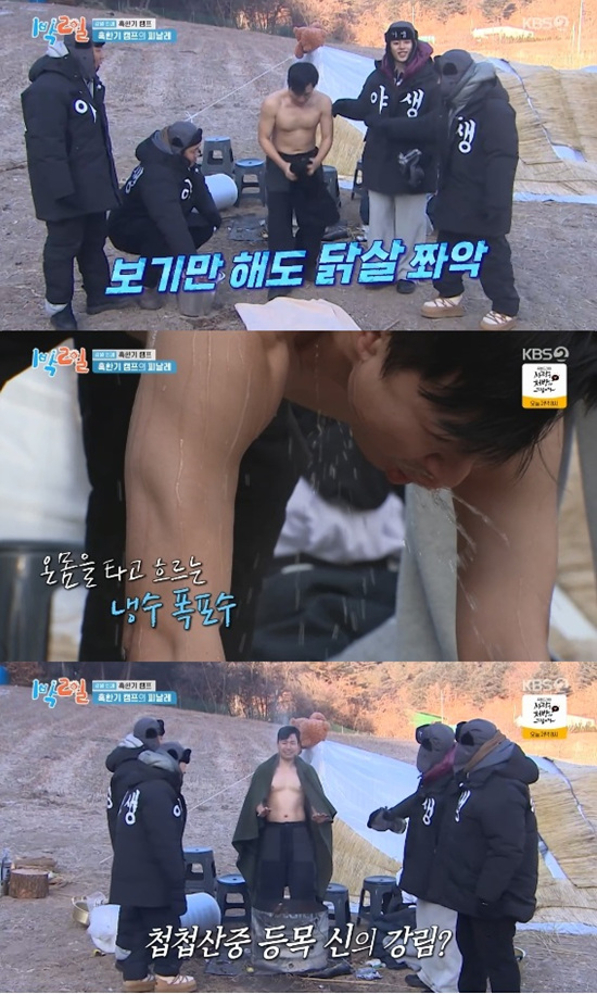 이날 멤버들은 혹한기 마지막 일정으로 등목을 준비하게 됐다. 김종민은 "그대로 얼 것 같은데"라고 걱정을 했다.