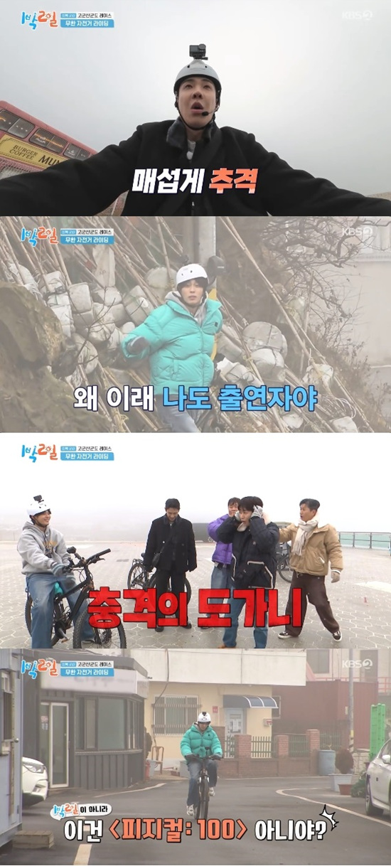 유선호는 계속된 자전거 라이딩에 지친 얼굴로 "이게 무슨 '1박 2일'이야. '피지컬100'이지"라고 말했다.