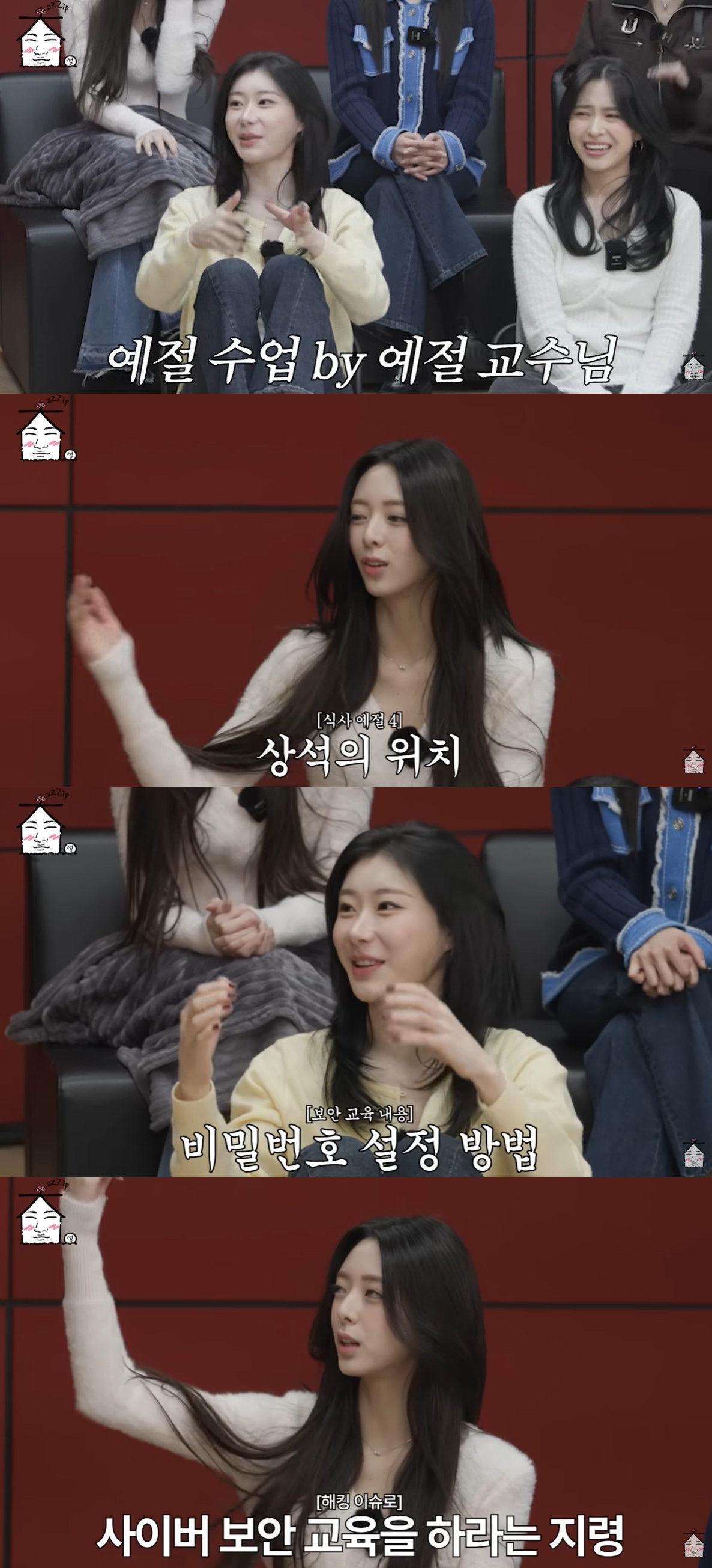 유나는 "해킹 문제가 한창 많았다. 그래서 연습생들에게 사이버 보안 교육을 하라는 지시가 떨어졌다"고 당시를 회상했다. 그러나 예지는 "저희도 기억을 못 한다. 메모장에 써 놓거나 한다"고 고백했다.