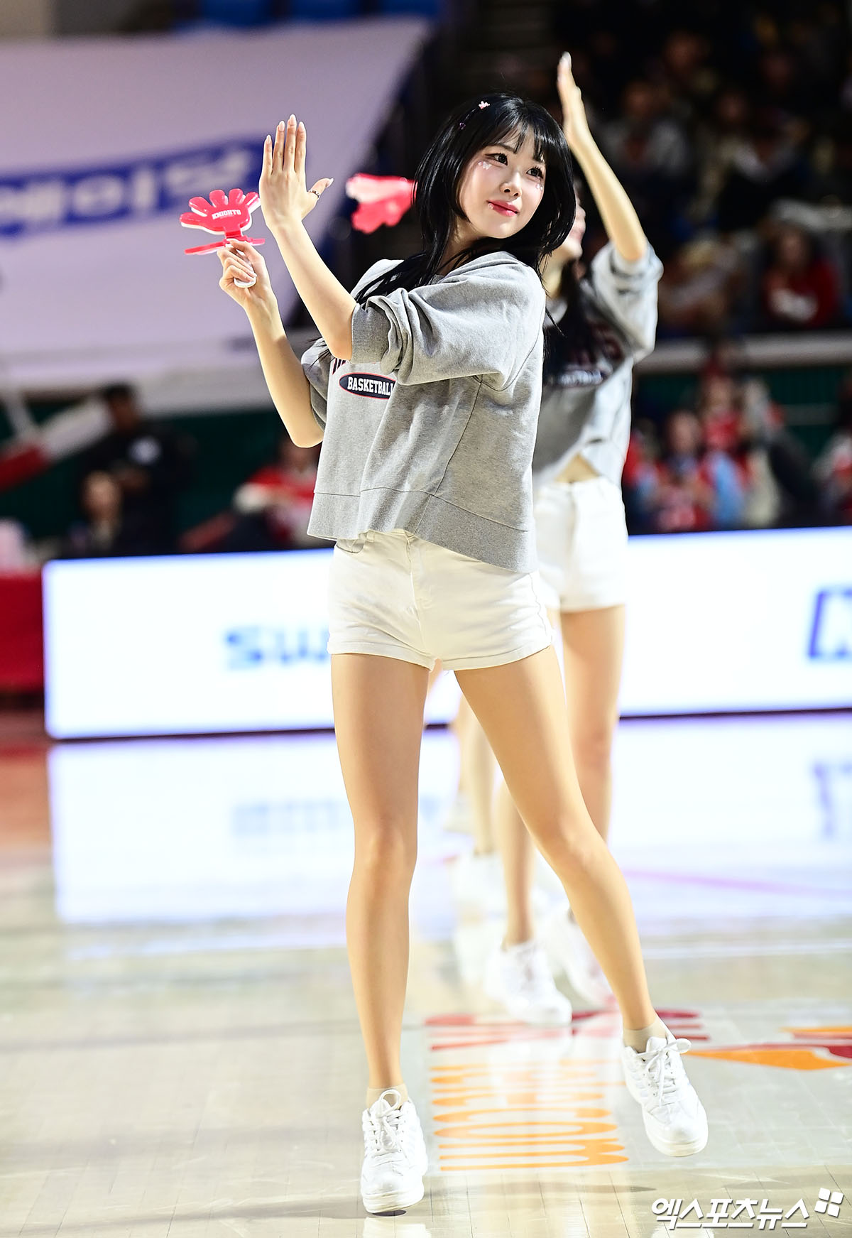 (엑스포츠뉴스 잠실, 박지영 기자) 2일 오후 서울 송파구 잠실학생체육관에서 열린 '2025-2026 LG전자 프로농구' 서울 SK와 부산 KCC의 경기, SK 치어리더 김자영이 열띤 응원을 펼치고 있다.
