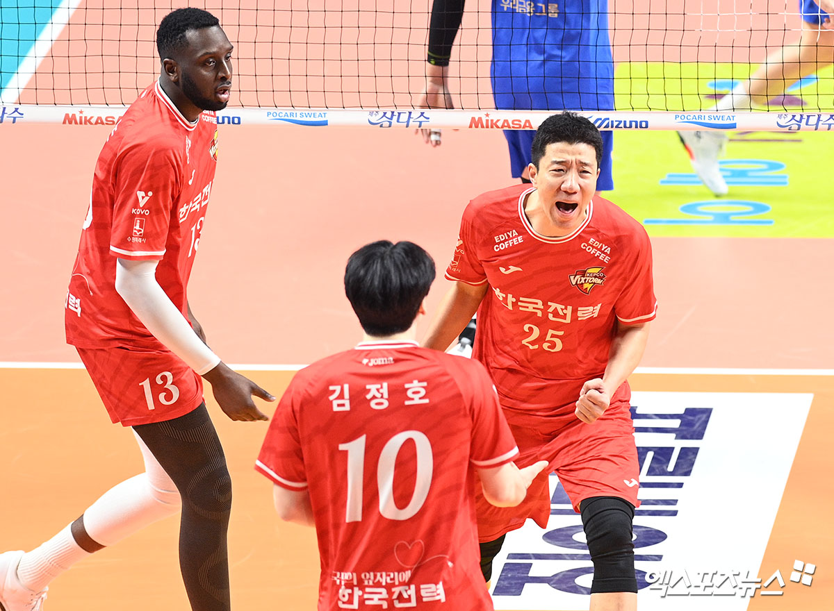 (엑스포츠뉴스 장충, 고아라 기자) 2일 오후 서울 장충체육관에서 열린 '진에어 2025-2026 V-리그' 우리카드와 한국전력의 경기, 한국전력 신영석이 득점한 뒤 기뻐하고 있다.