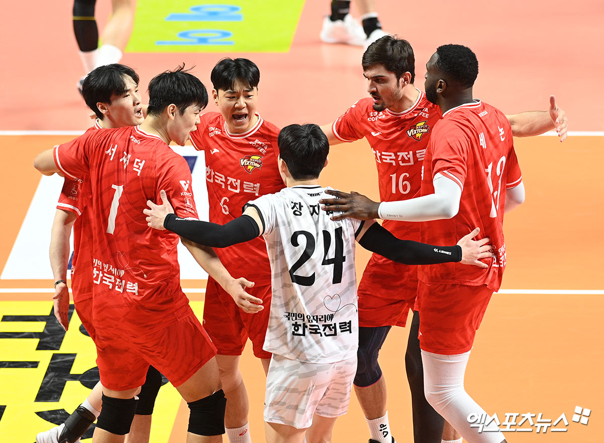 (엑스포츠뉴스 장충, 고아라 기자) 2일 오후 서울 장충체육관에서 열린 '진에어 2025-2026 V-리그' 우리카드와 한국전력의 경기, 한국전력 선수들이 득점한 뒤 기뻐하고 있다.
