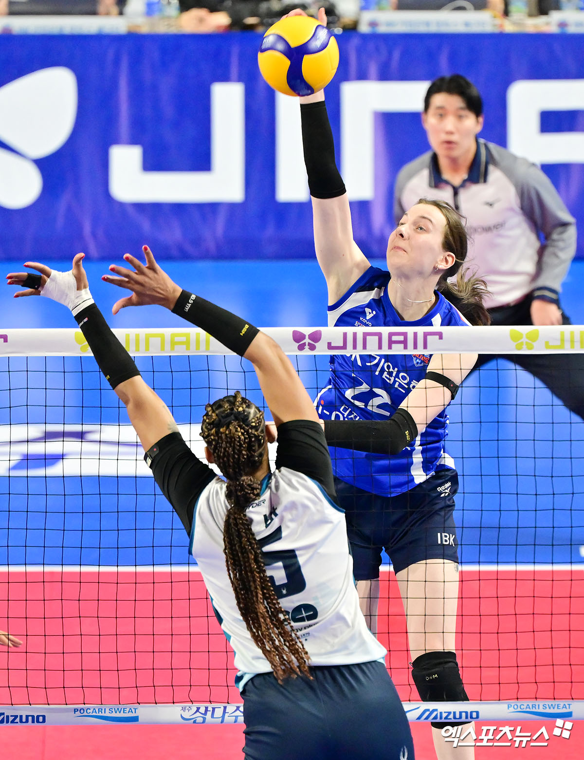 (엑스포츠뉴스 화성, 김한준 기자) 2일 오후 경기도 화성 종합실내체육관에 열린 '진에어 2025-2026 V-리그' IBK 기업은행과 GS칼텍스의 경기, 기업은행 킨켈라가 공격을 시도하고 있다.