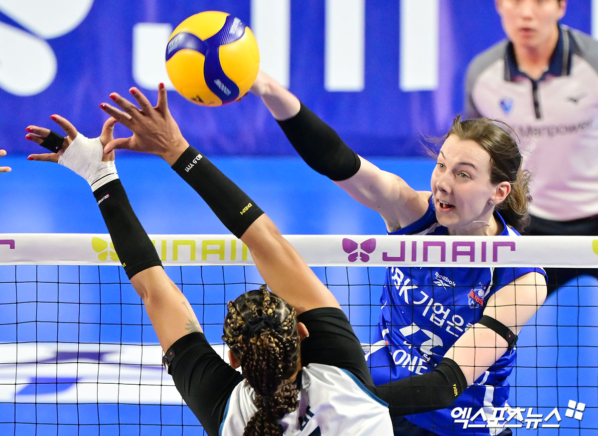 (엑스포츠뉴스 화성, 김한준 기자) 2일 오후 경기도 화성 종합실내체육관에 열린 '진에어 2025-2026 V-리그' IBK 기업은행과 GS칼텍스의 경기, 기업은행 킨켈라가 공격을 시도하고 있다.