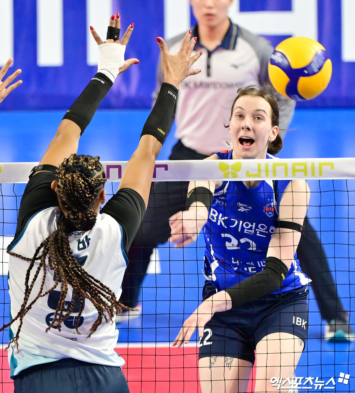(엑스포츠뉴스 화성, 김한준 기자) 2일 오후 경기도 화성 종합실내체육관에 열린 '진에어 2025-2026 V-리그' IBK 기업은행과 GS칼텍스의 경기, 기업은행 킨켈라가 공격을 시도하고 있다.