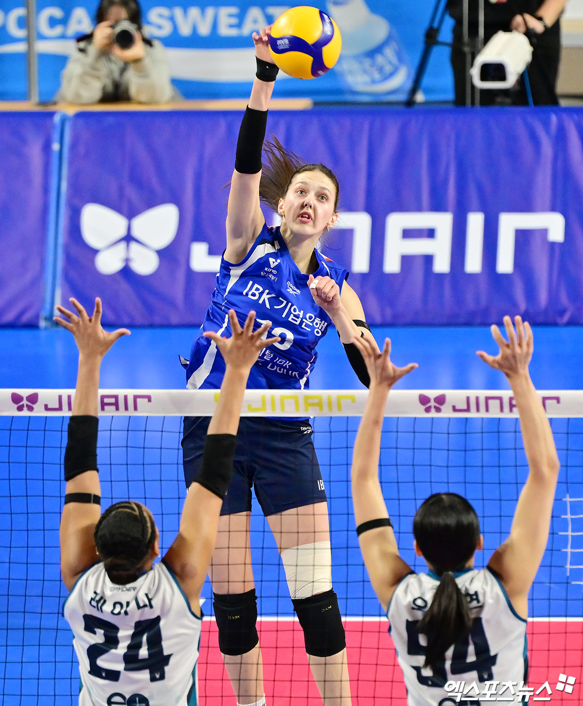 (엑스포츠뉴스 화성, 김한준 기자) 2일 오후 경기도 화성 종합실내체육관에 열린 '진에어 2025-2026 V-리그' IBK 기업은행과 GS칼텍스의 경기, 기업은행 빅토리아가 공격을 시도하고 있다.